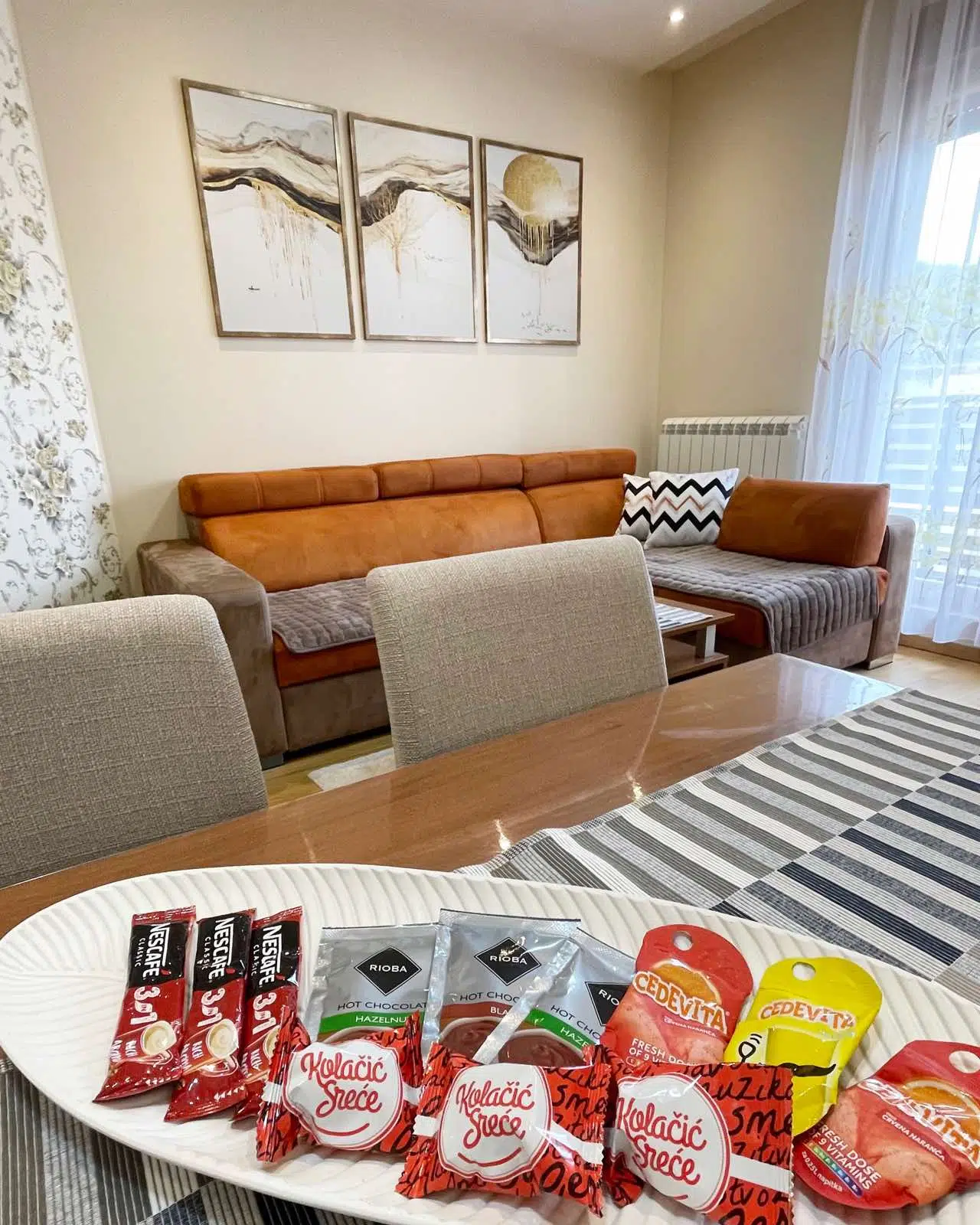 Nov, moderan i funkcionalan apartman sadrži sve što je potrebno za ugodan boravak do četiri osobe. Sastoji se od dnevnog boravka sa trpezarijom i kuhinjom koja je potpuno opremljena sa svim potrebnim posudjem. Apartman poseduju odvojenu spavaću sobu, kupatilo i terasu sa koje se pruza prelep pogled na skijalište i novu Gold gondolu koja je udaljena 50m.